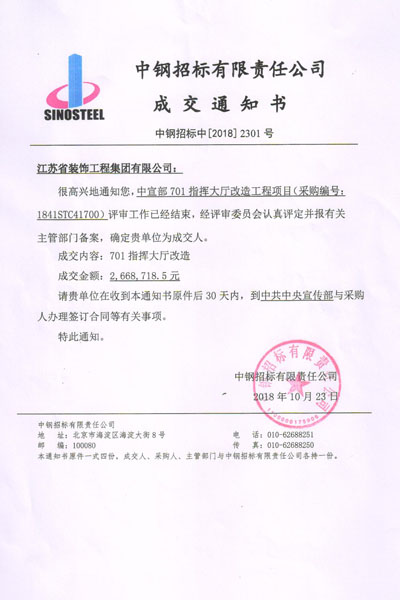 20181023日,集團接到中宣部701指揮大廳改造工程項目的中標通知書。