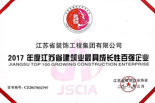 為更好地推動江蘇省建筑企業(yè)“抓管理、練內(nèi)功、增效益”,全面提高江蘇省建筑行業(yè)整體素質(zhì),江蘇省建筑行業(yè)協(xié)會開展評選全省建筑業(yè)百強企業(yè)活動。江蘇省裝飾工程集團(tuán)有限公司發(fā)展戰(zhàn)略清晰,市場行為規(guī)范,經(jīng)營業(yè)績突出,有較高的合同履約率,有完善的質(zhì)量安全保證體系,重視技術(shù)開發(fā)和應(yīng)用,注重人才培養(yǎng)和企業(yè)文化建設(shè),企業(yè)社會形象良好,被評為2017年度江蘇省建筑業(yè)最具成長性百強企業(yè)。